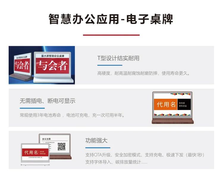 电子纸会议桌牌的出现,为智能化会议的提升带来了新的突破,引领会议管理走向无纸化、智能化。