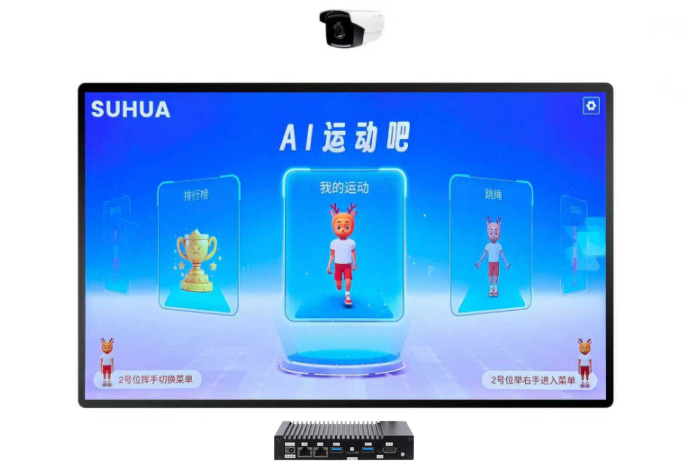 这是一款结合AI高集成摄像头、电视大屏的自助式锻炼运动产品,支持人脸、手势、人体姿态识别。